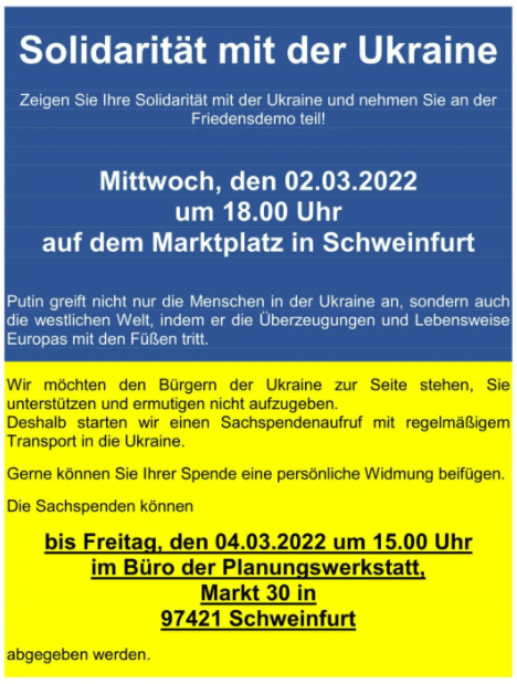 Приватна ініціатива (планувальна майстерня Lorz and Popp) хоче продемонструвати солідарність з народом України. З одного боку, у середу, 3 березня 2022 року, о 18:00 відбудеться мирна демонстрація на ринковій площі у Швайнфурті. З іншого боку, там, на ринковій площі, збиратимуть важливі товари допомоги для транспортування в Україну. 30, планувальна майстерня.